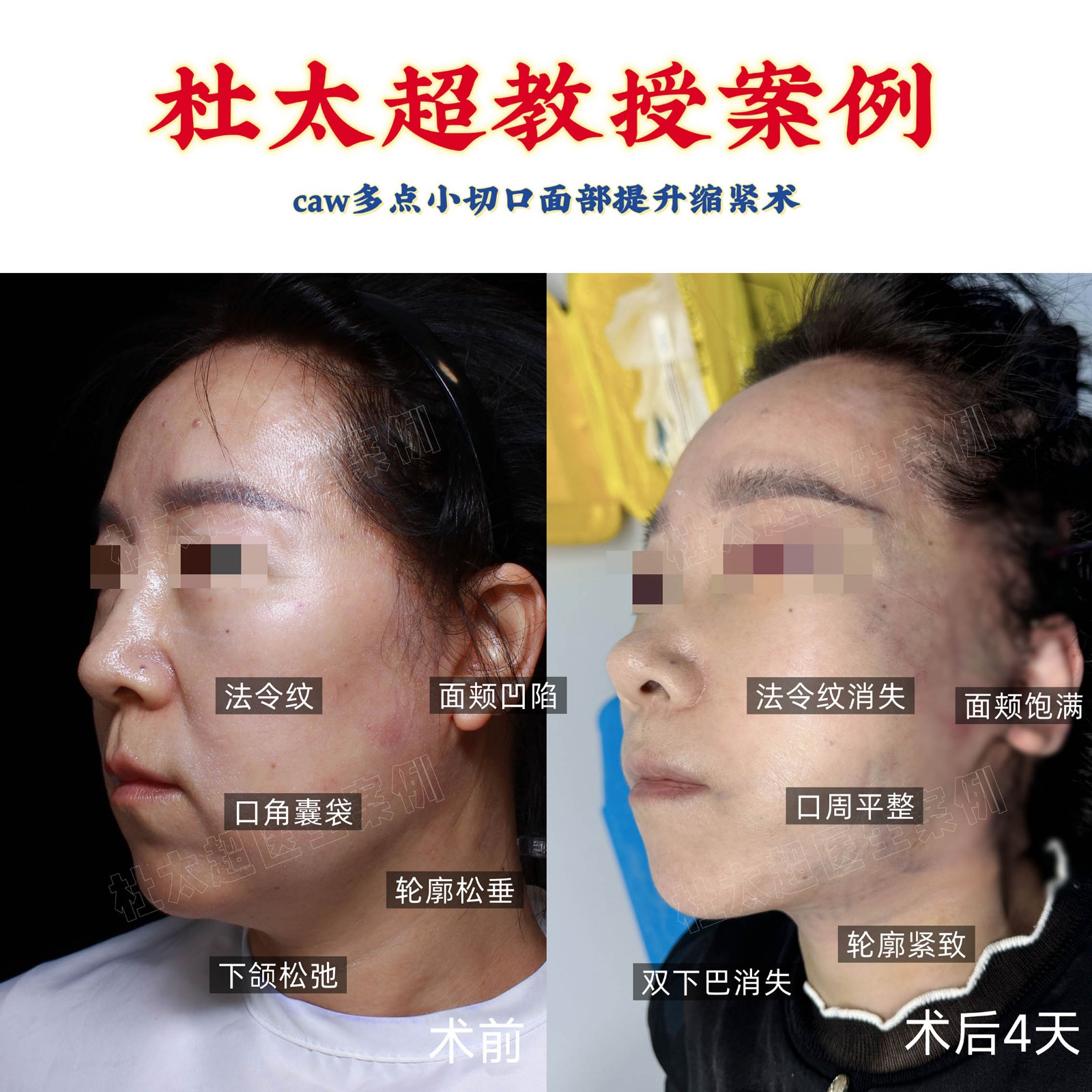 caw多点小切口面部提升缩紧术,术后4天真实变化 ✅肿胀明显消退✅面部年轻化初显 法令纹、口角纹淡化,下颌线紧致流畅,双下巴消失,面颊凹...