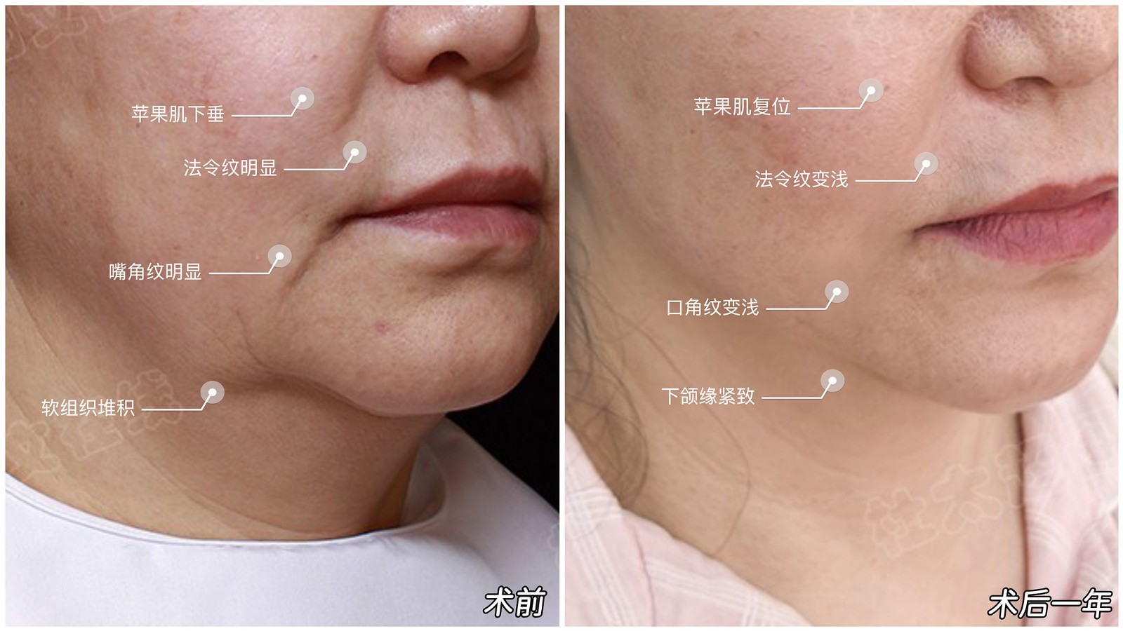 这位求美者的面部改善,需压实蓬松组织、复位下垂筋膜、针对性减脂,尤其重点处理口角囊带和模糊轮廓。减脂+紧肤+提升联合发力,才能换来紧...